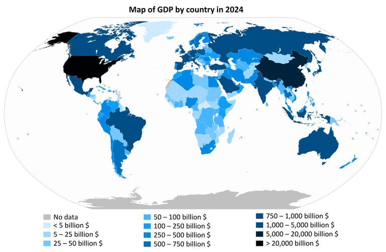The definition of Gross Domestic Product (GDP) in pictures: GDP measures all monetary flows in a given year, and is considered a proxy for the size of the economy. It is the leading indicator for tracking economic growth. As economic growth has been very heterogeneous in space over the last few decades, the world map of GDP by country shows that GDP today is very unequal between the different countries of the world. GDP takes no account of the direction of monetary flows, nor of the destruction caused or tasks not monetized. For example, a destructive activity such as war can contribute to an increase in GDP, as it enables us to spend more money (on defense, arms production, etc.). In the final analysis, increasing GDP (i.e. economic growth) says nothing about essential aspects of our existence, such as happiness, individual or collective well-being, the state of the biosphere... This raises an essential question: is a collective project based on the ultimate goal of increasing GDP a sensible and desirable one? Apparently so, since GDP growth has become the sole compass for politicians the world over... Image source: Anders Feder, CC BY-SA 4.0 <https://creativecommons.org/licenses/by-sa/4.0>, via Wikimedia Commons. https://commons.wikimedia.org/wiki/File:Countries_by_GDP_(nominal).svg